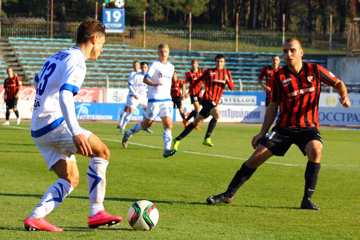 Начало встречи прошло относительно спокойно. Только на 6-й минуте Шагойко сделал дальний заброс в штрафную. Сквернюк принял мяч и выложил на ближнюю штангу передачу Шрамченко, который всё сделал правильно, но Гутор выбрал идеальную позицию, в самый последний момент, в падении, ногами отвёл угрозу от своих ворот. На 18-й минуте свой первый опасный момент создали хозяева поля. Веретило от правой бровки навесил в штрафную. Рассадкин выиграл борьбу и пробил по воротам, но немного не хватило точности.