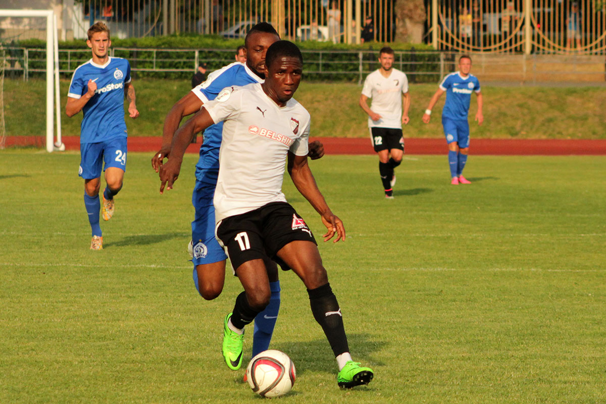 Два тайма отчётного матча были словно инь и ян. В первые сорок пять минут происходящее на поле вызывало зевоту. Из скучного катания мяча центральными защитниками и череды технических помарок в центре поля можно выделить три момента. На 18-ой минуте, коварно, с линии штрафной пробил Хващинский, но Панкратов сыграл выше всяких похвал. На 44-ой минуте Матвеенко в штрафной накатил под удар Юшину. Но удар с 14-ти метров пришёлся выше ворот. Через минуту вполне могли организовать гол в раздевалку динамовцы. Всё тот же Хващинский, из-за пределов штрафной, мощно пробил по воротам. Панкратов отбил перед собой, но Роткович, которому оставалось поразить пустые ворота, замешкался и запорол 100% момент.